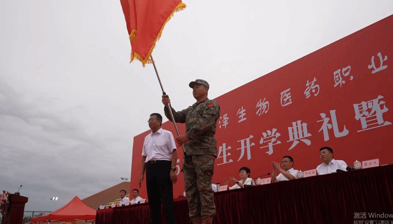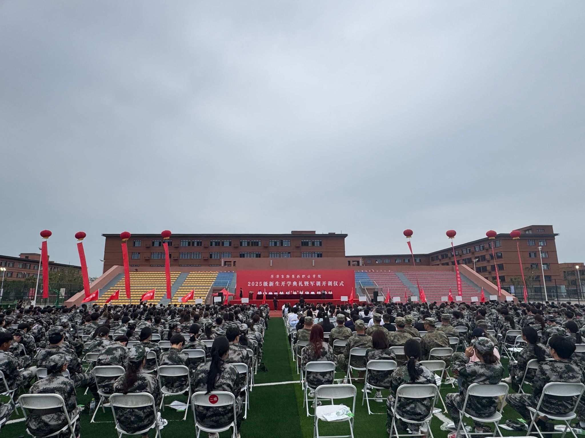 9月8日上午9时,菏泽生物医药职业学院2025级新生开学典礼暨军训动员大会在体育场举行。
