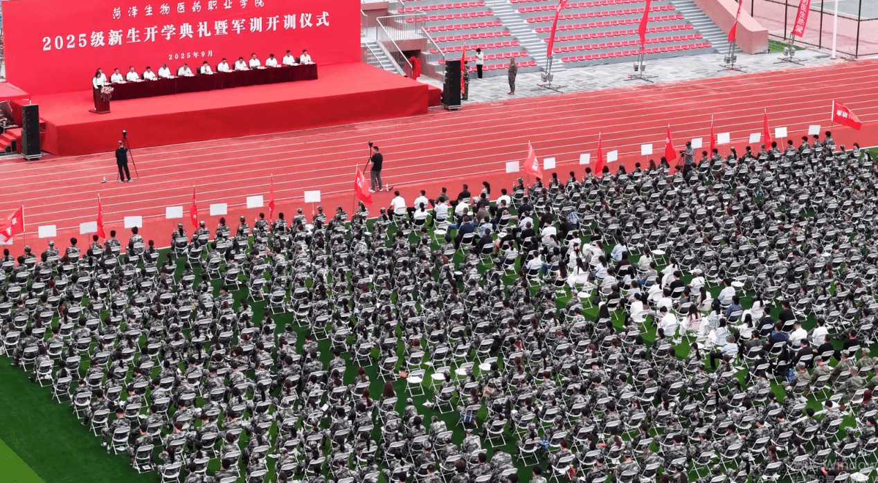 9月8日上午9时,菏泽生物医药职业学院2025级新生开学典礼暨军训动员大会在体育场举行。