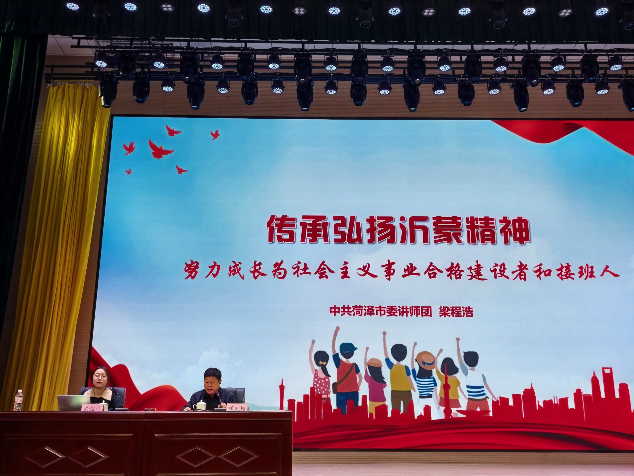 青少年学生是民族的希望、国家的未来。作为新时代青年,只有铭记历史,才能更好开创未来,成长为担当民族复兴大任的时代新人。为此,10月17日,菏泽市委宣讲团来到我校为同学们带来一场意义重大的“沂蒙精神代代传”主题宣讲活动。学校领导班子成员、各部门负责同志、全体教职工、学生代表齐聚活动中心大礼堂,怀着崇高的敬意聆听这动人心灵的主题演讲。校长杨先彬同志主持本次活动。